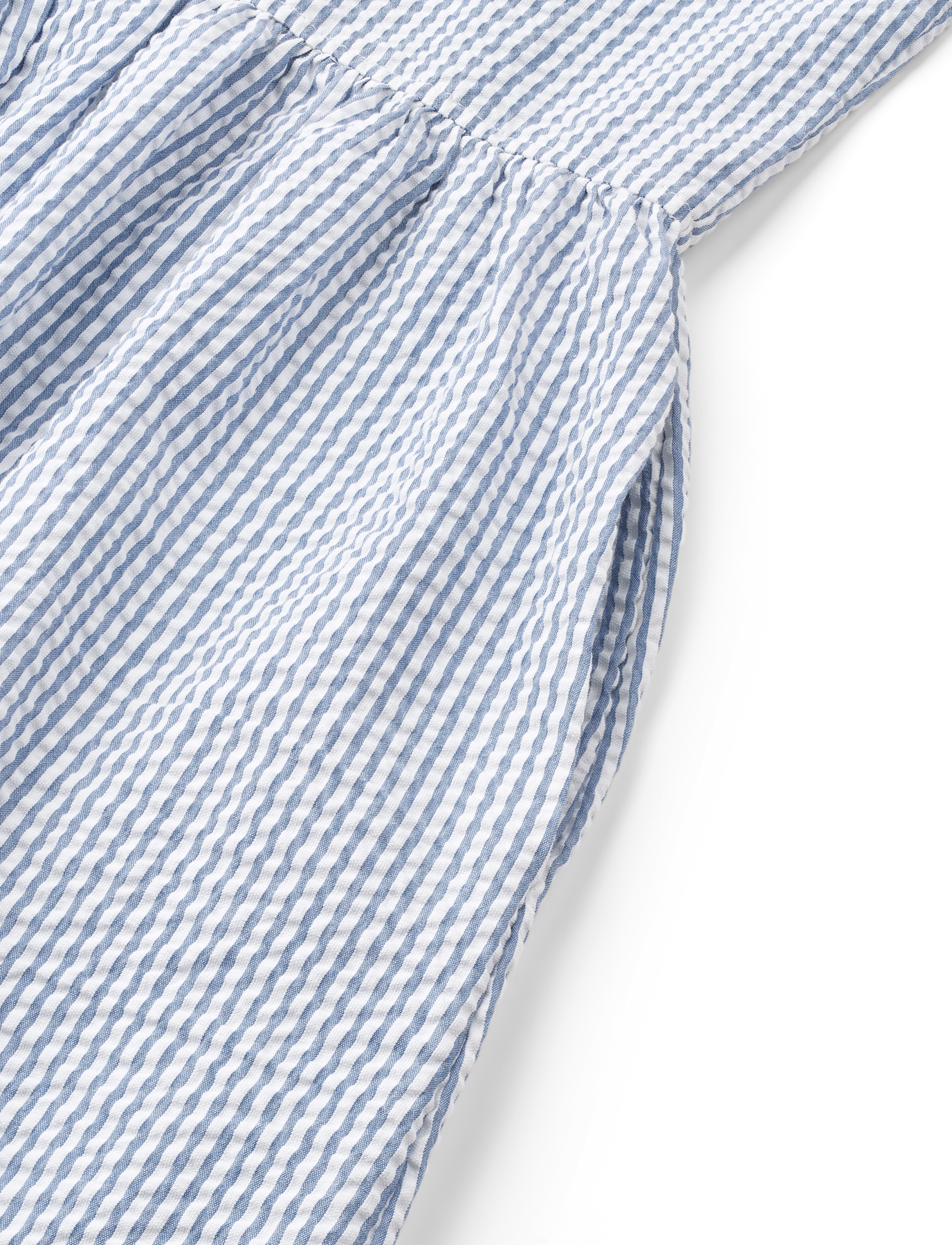 Simple, sleeveless dress in a relaxed and comfortable cut with small gatherings at the top of the skirt. The dress is made in 100% organic cotton seersucker. All interior stitching is French seamed to get a delicate and luxurious finish. Noelle dress is medium length, has buttons in the back and practical pockets on the side. The dress can be used at the beach with flip-flops, but can also be worn with nice sandals and other accessories. On colder days, the dress can be worn with a t-shirt underneath or a blazer over it.