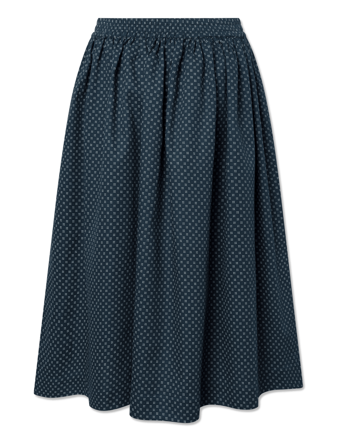 Nice, soft skirt in organic cotton. Olga skirt has an elastic waistband and lots of width, which makes it nice and light and airy on hot summer days. All interior stitching is French seamed to get a delicate and luxurious finish. Pair the Olga skirt with a t-shirt, knitwear or a vest or jacket, depending on the weather and the look you desire. True to size with a loose fit.